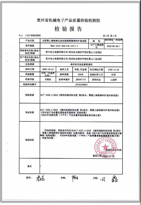 上一篇:鋁芯交聯(lián)聚乙烯絕緣聚烯烴護(hù)套無(wú)鹵低煙阻燃A類(lèi)電力電纜 檢驗(yàn)檢測(cè)報(bào)告